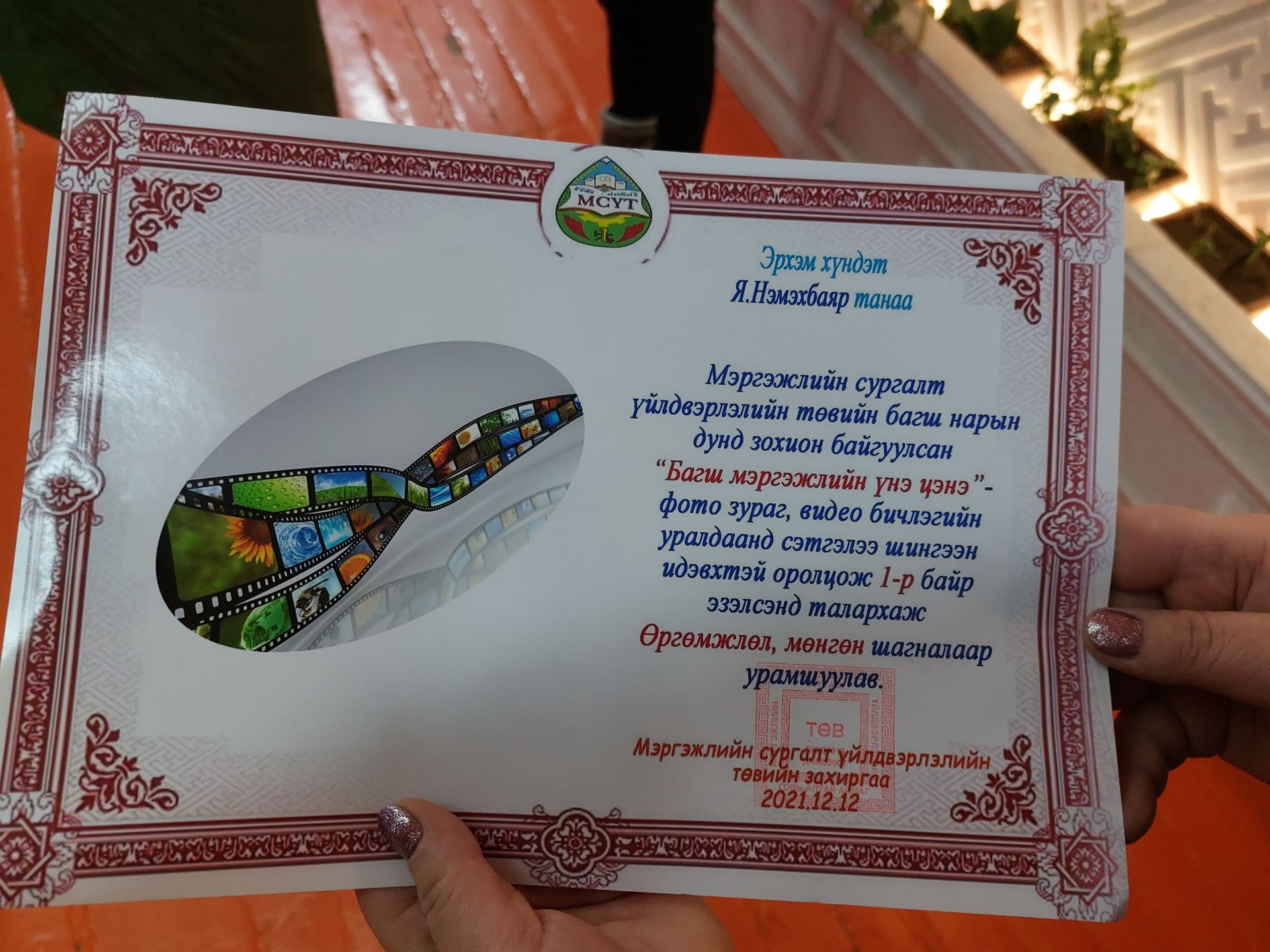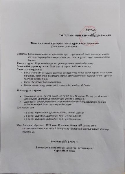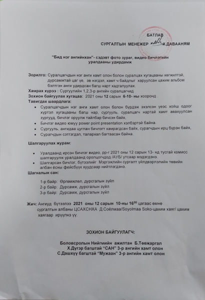 Мэргэжлийн сургалт үйлдвэрлэлийн төвийн багш, сурагчдын дунд "Багш мэргэжлийн үнэ цэнэ", "Бид нэг ангийнхан" сэдэвт Фото зураг, видео бичлэгийн уралдаанд оролцогчдын шагналыг гардуулан өглөө.