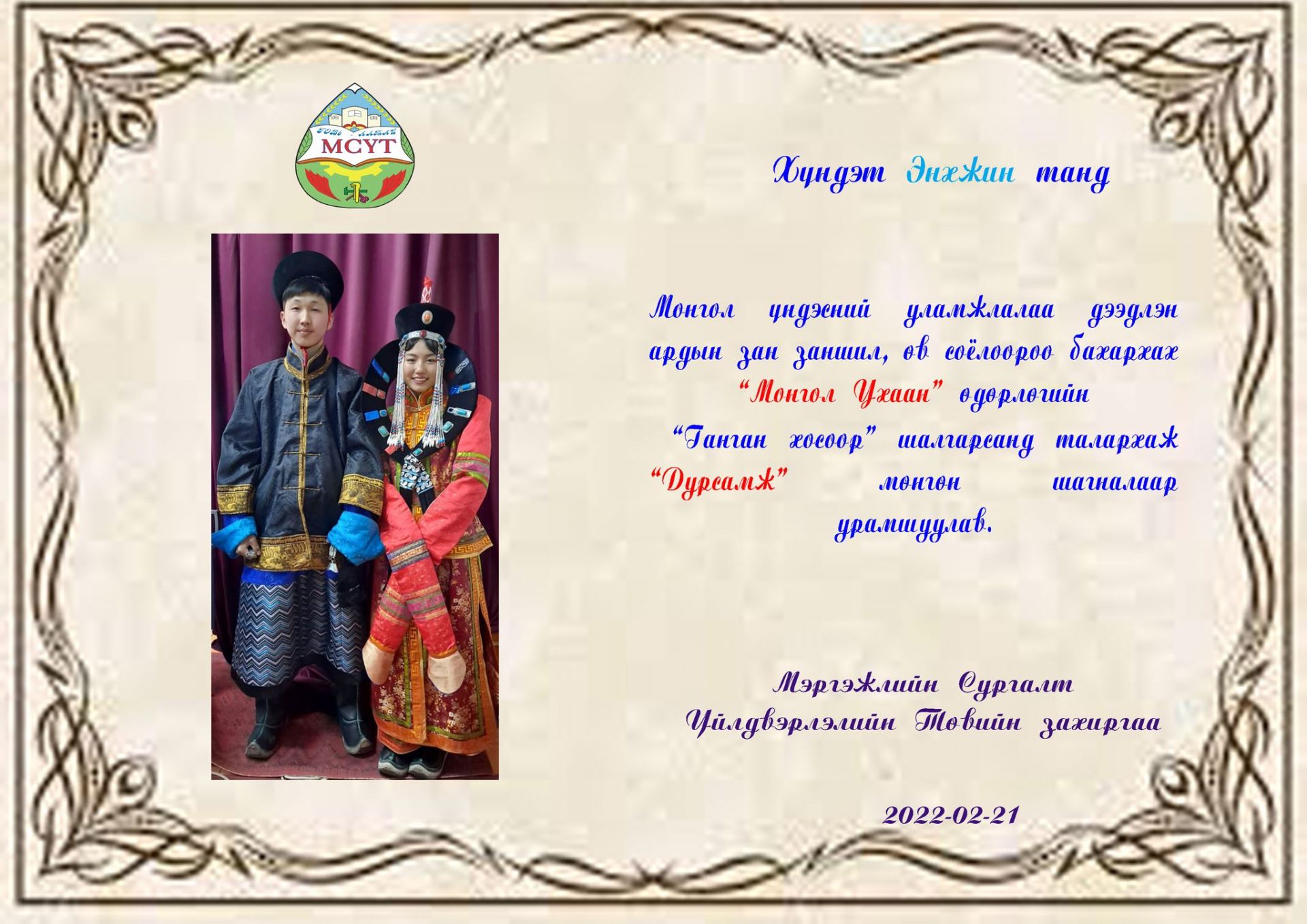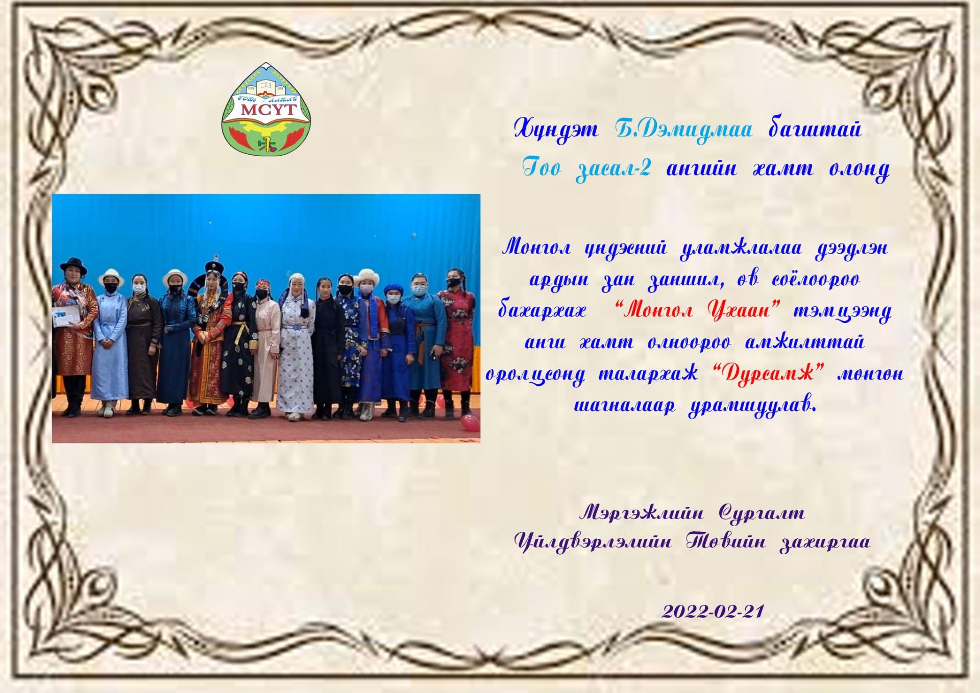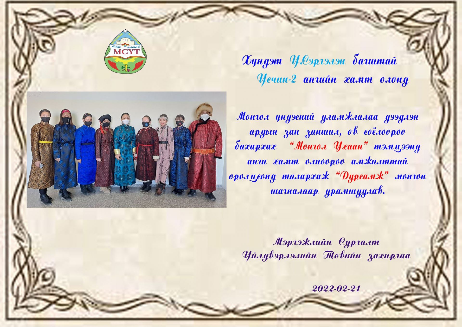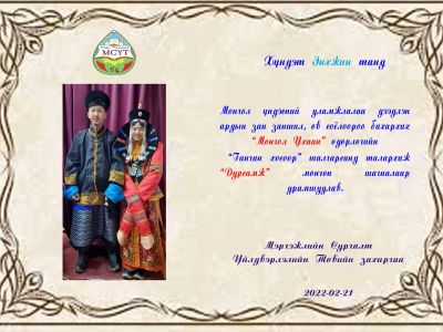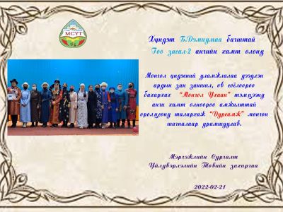 Монгол үндэсний өв уламжлалаа дээдлэн, ардын зан заншил, өв соёлоороо бахархах, дээл хувцсаа зөв өмсөж хэрэглэрийг сургуулийн багш ажилтан, сурагчдад түгээн дэлгэрүүлэх, зөв хандлага төлөвшүүлэх хүрээнд анги хамт олон амжилттай оролцлоо.