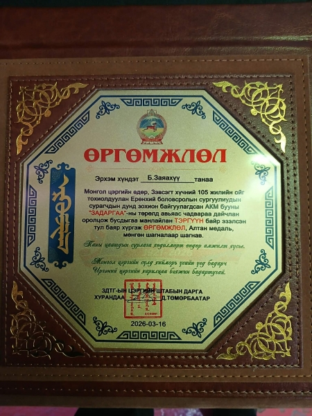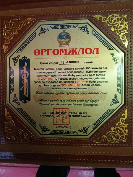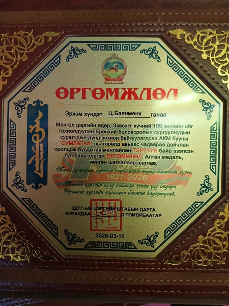 АКМ бууны "СУМЛАГАА" төрөлд мөн тэргүүн байр эзэлж хос алтан медаль өргөмжлөл мөнгөн шагналаар шагнууллаа.