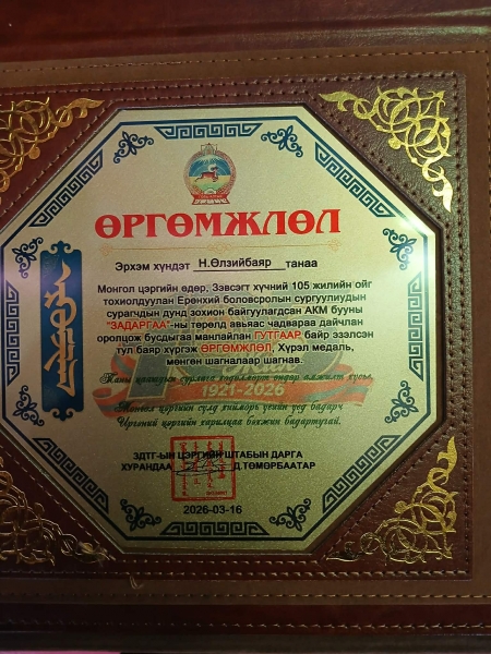 1. Хэрэглээний программ 3-р ангийн суралцагч Э.Ууганбаяр: АКМ бууны "ЗАДАРГАА"-ны төрөлд дэд байр мөнгөн шагнал.